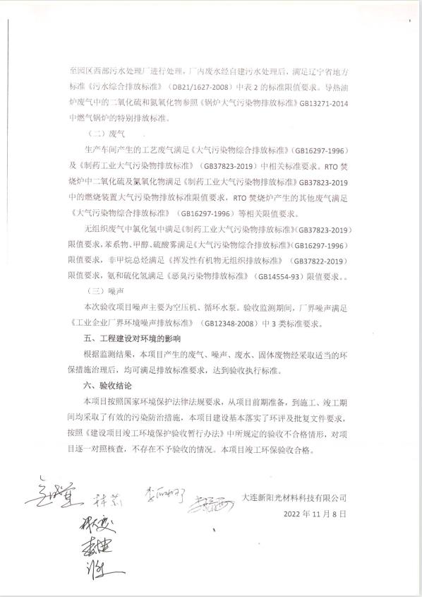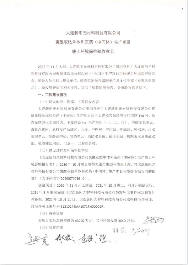 大連新陽光材料科技有限公司 聚酰亞胺單體和醫(yī)藥(中間體)生產(chǎn)項目 竣工環(huán)境保護驗收監(jiān)測報告